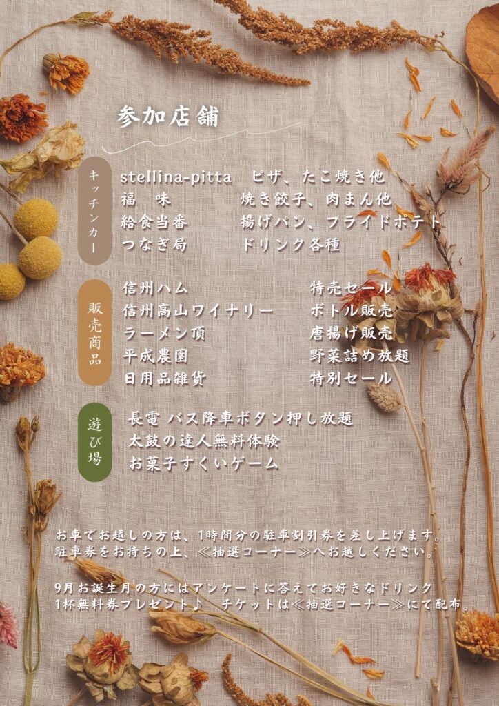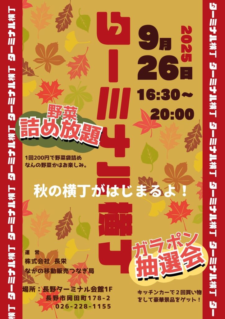 9月26日ターミナル横丁開催します! 出店情報 2025.09.25 外飲みが快適な季節になりました。その場でわいわい楽しんだり夕ご飯用にテイクアウトしたりいろんな楽しみ方がターミナル横丁にはあります。大好評の野菜詰め放題企画も継続中です。ぜひ週末のひと時をターミナル横丁でお楽しみください!